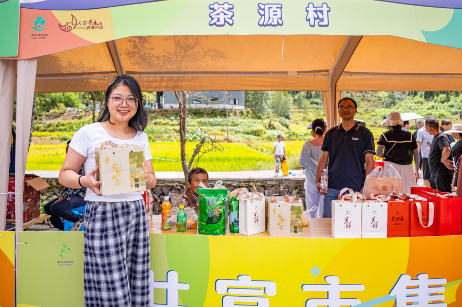 活动当天,稻田边的“共富展销区”更是热闹。农村指导员吴向东和周秋慧一边帮游客装袋,一边讲起荒野茶和高山大米的故事:“这米种在海拔千米的田里,喝的是山泉水,煮出来满屋香!”游客听着新鲜,纷纷扫码下单。得益于工坊此前借浙BA赛事“打开销路”的经验,这次展销的600余斤田鱼、200余斤高山翠螺、5斤金奖大米没多久就被抢空。“本来是来玩的,结果买了3斤螺、2袋米,回去给亲戚尝尝!”杭州游客王女士拎着满手特产笑着说。