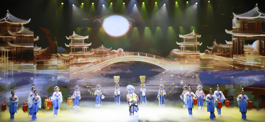 演出开篇,便以独特的叙事方式抓住了所有人的目光。第29届中国戏剧梅花奖获得者、上海京剧院著名演员、泰州梅兰芳京剧团艺术指导傅希如以“导赏人”的身份走上舞台,伴随泰州“三水交汇”的水墨画卷,解读“水浒的豪迈、水墨的雅致、水袖的灵动”所承载的城市文脉,拉开“时空邀约”的序幕。