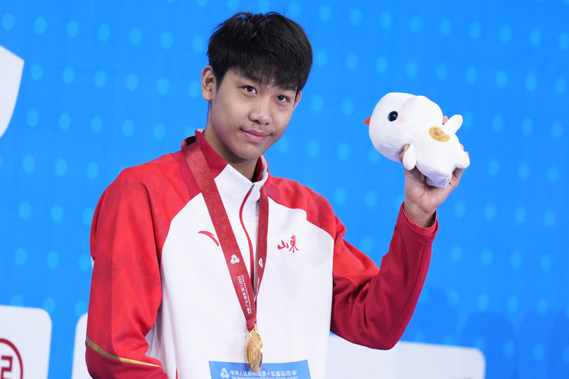 新华社照片,深圳(广东),2025年11月17日\n 11月17日,冠军山东队选手张展硕在颁奖仪式上挥舞吉祥物喜洋洋。\n 当日,第十五届全国运动会游泳男子1500米自由泳决赛在广东省深圳市举行。\n 新华社记者 杜宇 摄