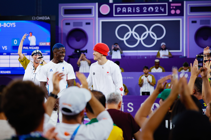 2024年8月10日,菲利普·金(中右)和达尼斯·西维尔(中左)在比赛后一起向观众致意。 当日,在巴黎奥运会霹雳舞男子金牌赛中,加拿大选手菲利普·金战胜法国选手达尼斯·西维尔,夺得冠军。\n 新华社记者 沈伯韩 摄