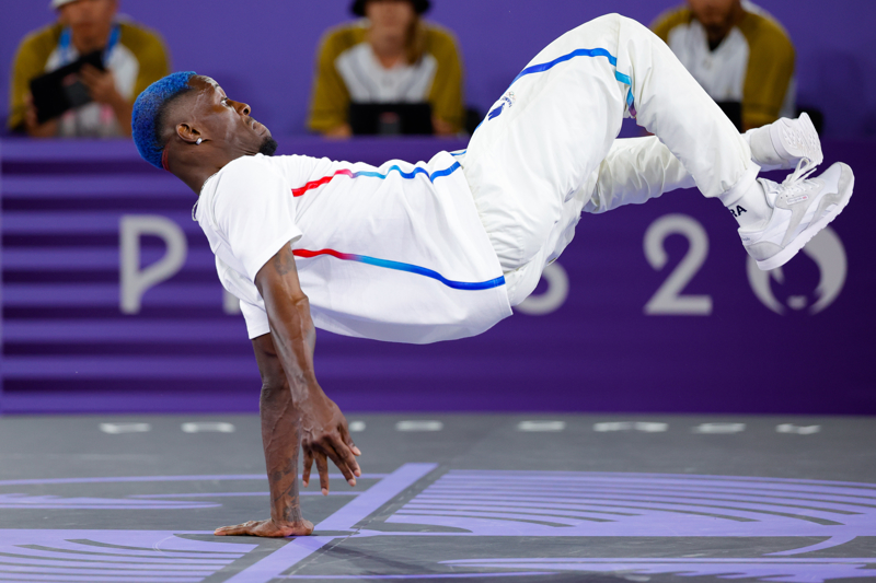 2024年8月10日,达尼斯·西维尔在比赛中。\n 当日,在巴黎奥运会霹雳舞男子金牌赛中,加拿大选手菲利普·金战胜法国选手达尼斯·西维尔,夺得冠军。\n 新华社记者 沈伯韩 摄