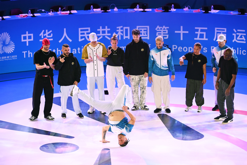 新华社照片,广州,2025年11月18日,裁判在比赛开始前表演。当日,第十五届全国运动会霹雳舞女子组淘汰赛在广州举行。 新华社记者 唐奕 摄