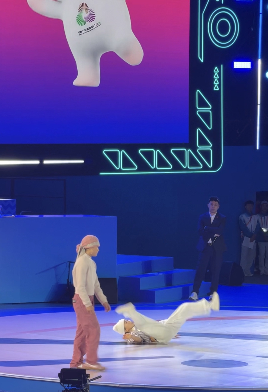 这一点上,其实也能解释为什么过去几年,国家体育总局、各地方体育管理部门会愿意在全运会、亚运会里给霹雳舞一个机会——上届全运会,霹雳舞第一次成为正式比赛项目,产生了全运会历史上的首枚霹雳舞金牌;杭州亚运会也把Breaking列入正式项目,为巴黎奥运会“预热”;到了本届全运会,霹雳舞成为湾区全运会的一道青春潮流风景。