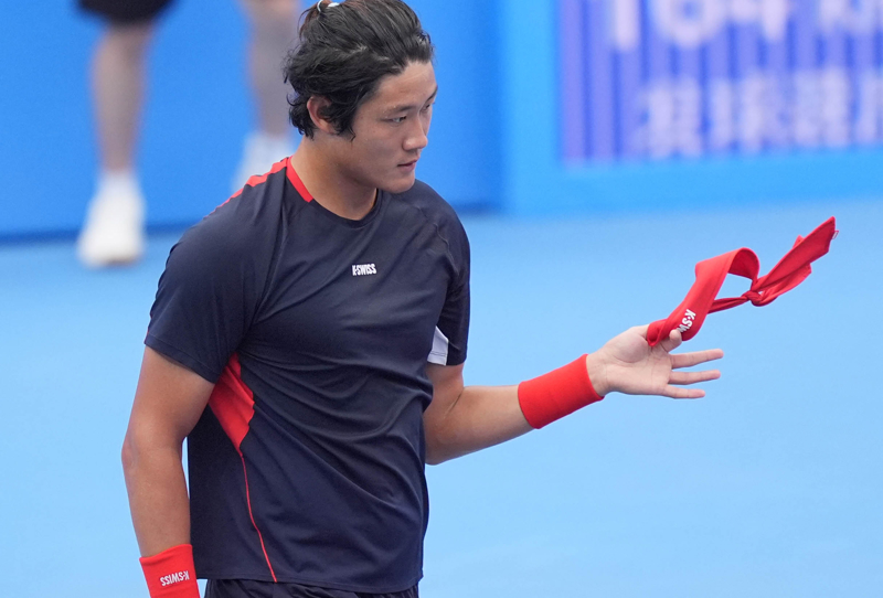 新华社照片,横琴(广东),2025年11月13日\n 11月13日,上海队选手张之臻在男子单打比赛结束后取下头巾。最终,他2比0战胜湖南队选手周洺舟,晋级下一轮。\n 当日,第十五届全国运动会网球项目男子单打第一轮在广东横琴举行。\n 新华社记者 颜麟蕴 摄