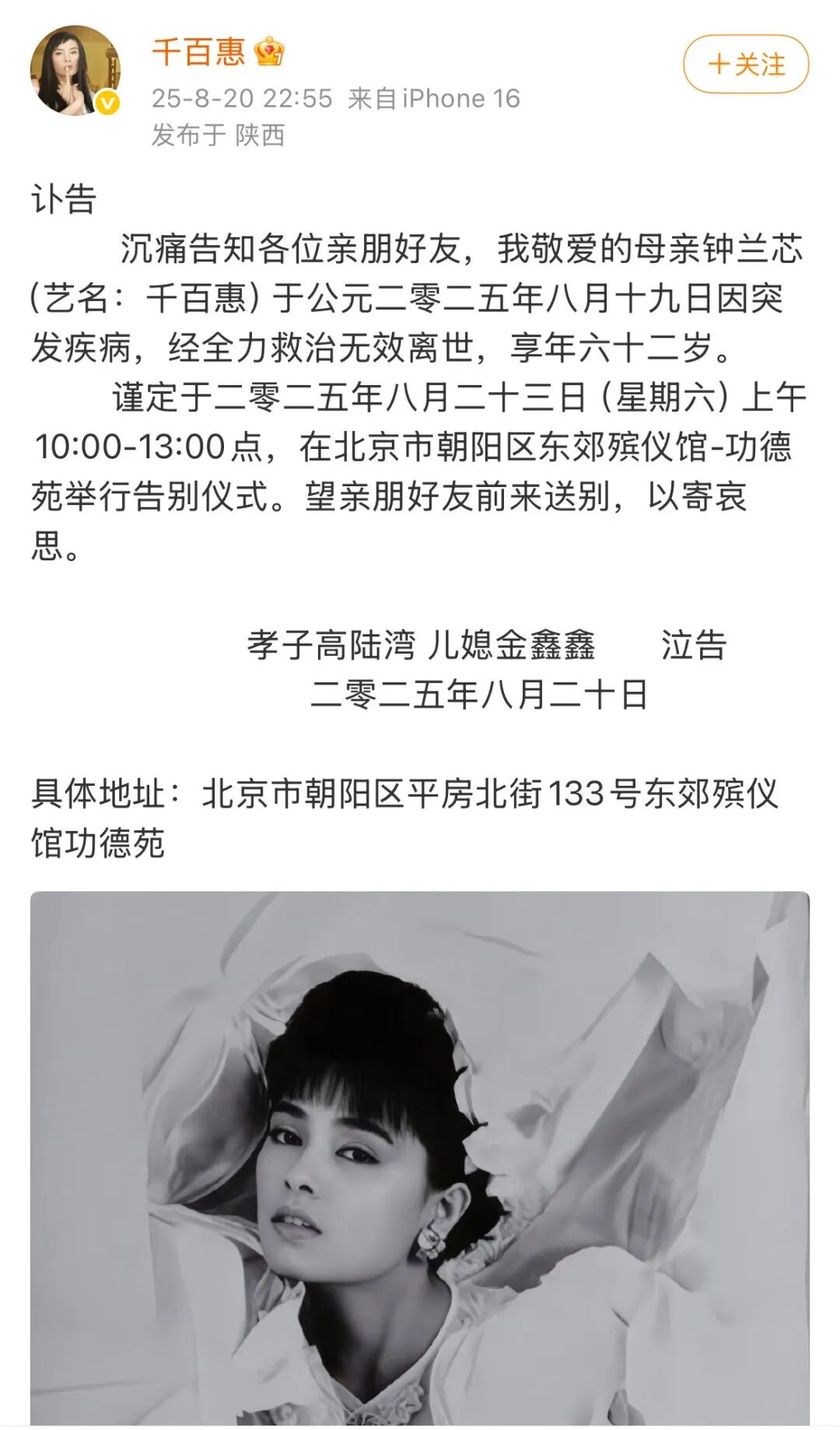 8月20日,黄安发文称,中国台湾著名歌手千百惠于8月19日凌晨因病去世,享年62岁。她的代表作品包括《走过咖啡屋》《想你的时候》等。