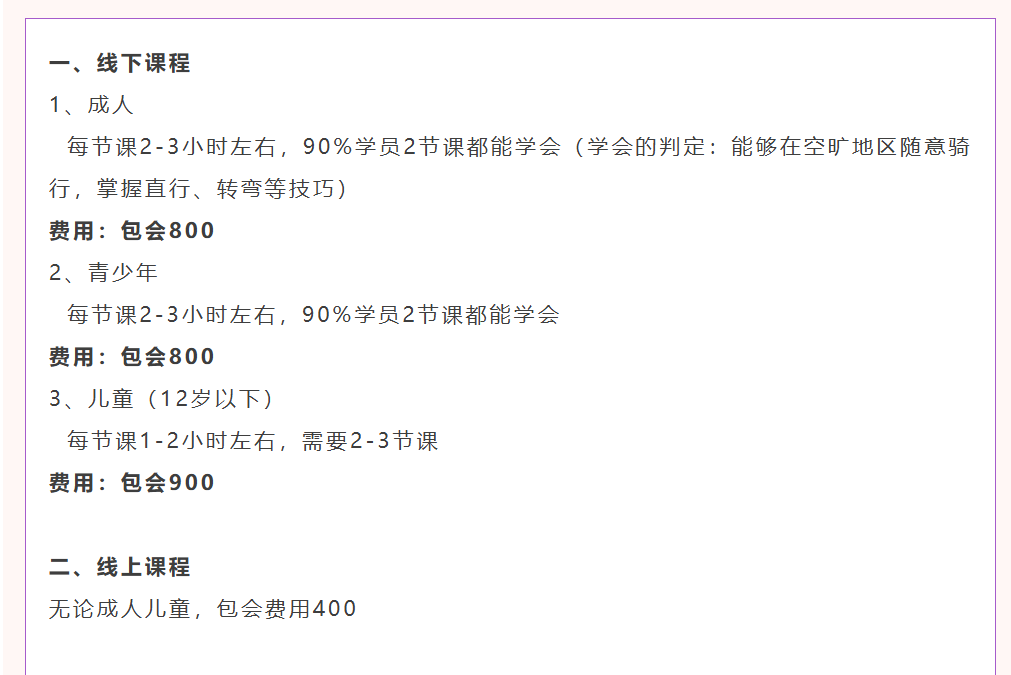 记者搜索发现,有不少人提供上门教学自行车服务。费用方面,线下教学800元包会,成人和青少年每节课2-3小时,儿童每节课1-2小时,90%的人两节课都能学会。线上课程400元包会,目前已教学超200名学员。